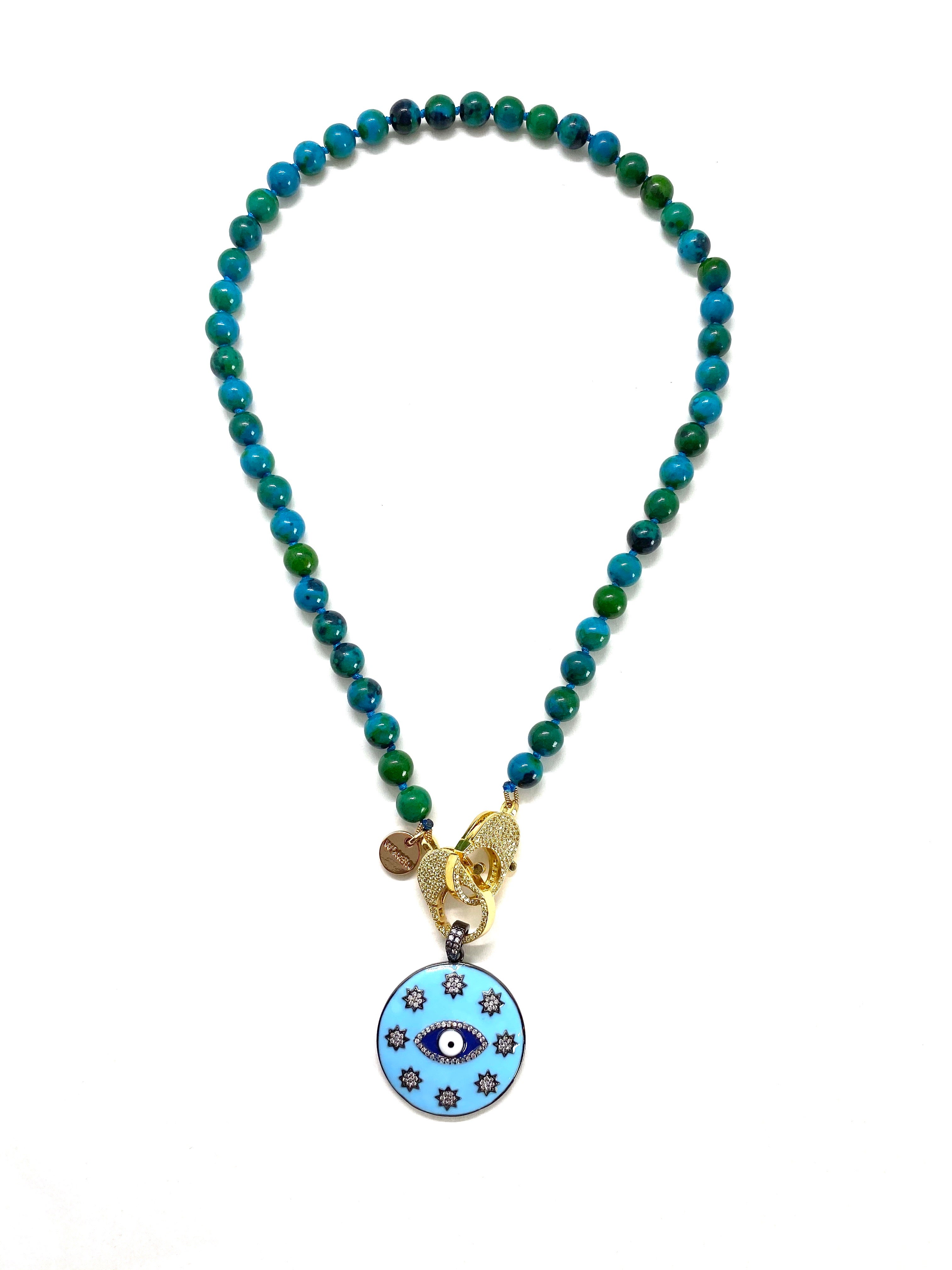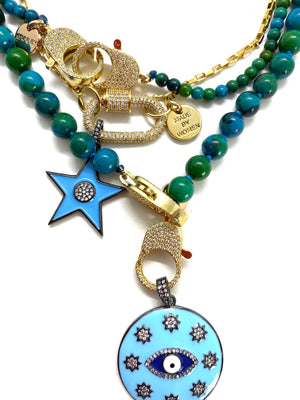 55cm total length, pedant 3cm diameter. Sultry blue green necklace with elegant clear zirconia studded gold claps and magnificent round blue star pendant. This gorgeous necklace is made with love and care by vulnerable women in conflict zone. Your purchase will not only help provide badly needed livelihoods, it will also provide wellbeing as working with beautiful stones and colors, in a safe environment in the company of each other provides emotional health, peace and serenity. Clip it on your neck and Join the mouvement- post a picture of yourself and tag #clip2impact @raniakingemadebywomen.